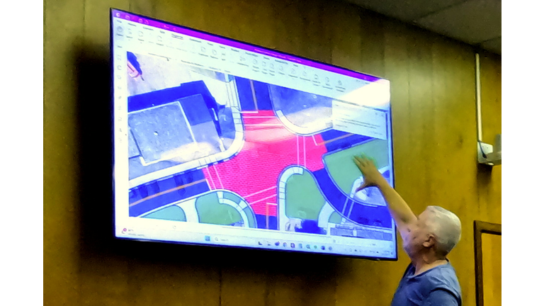 Councilman Jeff Creed explains a plan of Riverside and Mulberry streets showing where new brick is set to be installed.