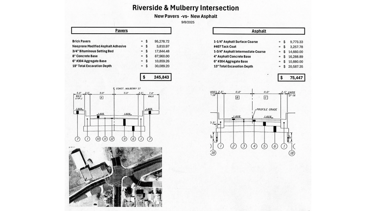 City administration had requested the option to save money by repaving with asphalt, instead. A handout showed the comparison between deeper “paver” reconstruction (left) and asphalt (right).