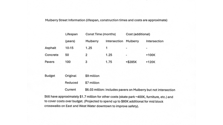 A September 17th handout on cost and time estimates for pavement at Mulberry and Riverside streets.
