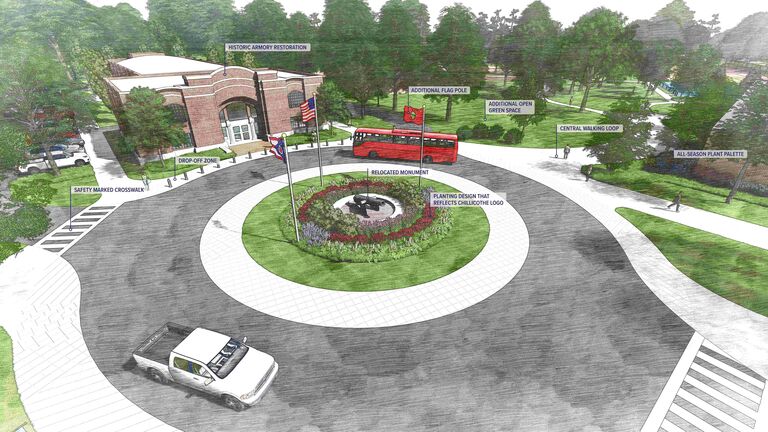 Old Memorial Armory with expanded parking and its front cul de sac is in the center. The pavilion for the Chillicothe Farmers Market and other events on the site of Diamond No. 1 is lower right from that, with the hillside amphitheater (circular pattern) below that.