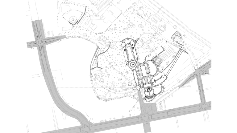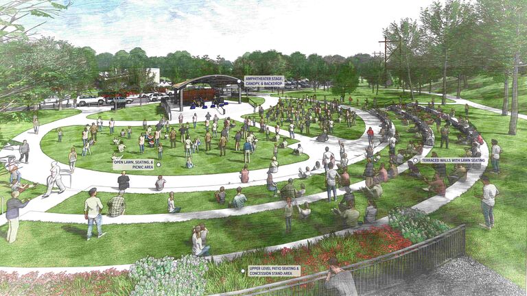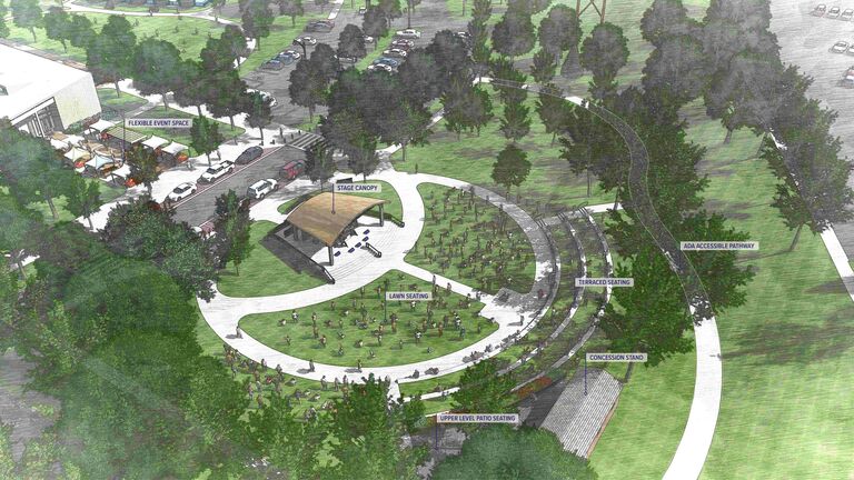 The “flexible event space” between the Pavilion and the Amphitheater, viewed from the redesigned park road.