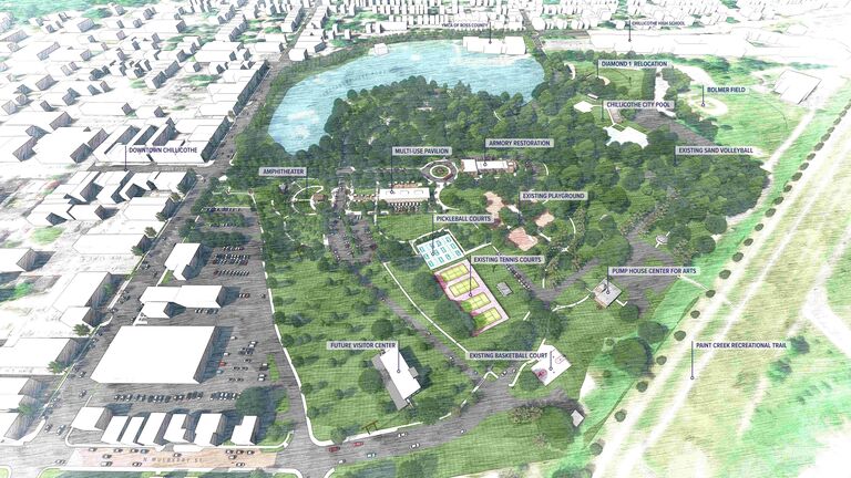 The renderings and map derived from the official pdf’s are below, but the originals can be found under “Engage Chillicothe, the City of Chillicothe’s official participation platform.” Within that is the “Appalachian Community Grant Program (ACGP),” which has an “Updated Aerial” pdf from October 18th, the latest available map of the project. Then starting with “Updated Project Components” are six pages of renderings of major aspects of the plan.