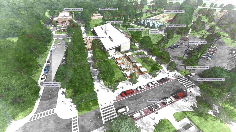 Old Memorial Armory is at the left top. Near center is the Pavilion building, with space between it and the hillside Amphitheater off the lower right corner. The redesigned parking area is right center. The Pickleball and tennis courts are upper right of the pavilion.