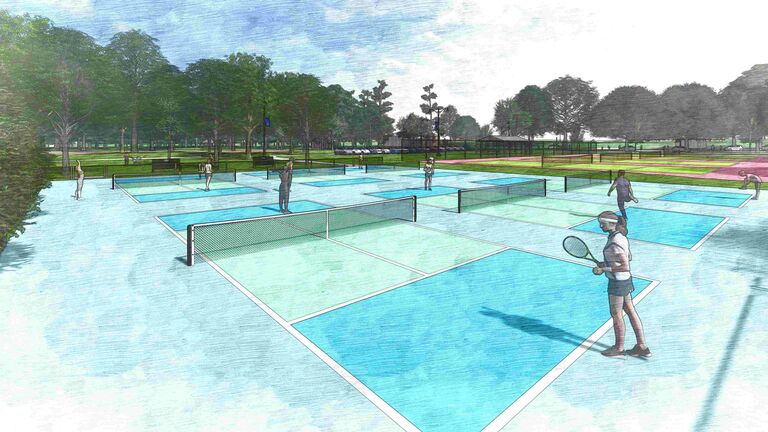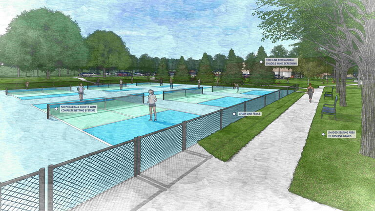 The park road at the left side has been removed. The corner of the Pavilion is in the upper right, with relocated Pickleball court beyond (in blue).