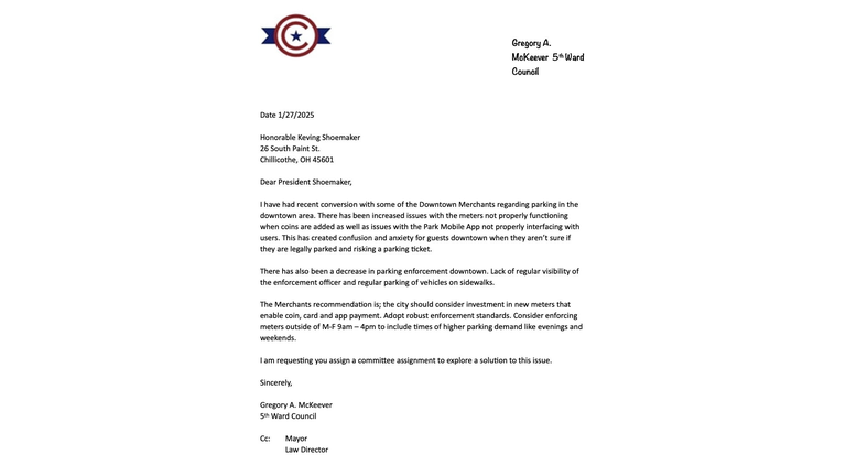 Greg McKeever, Development Committee chair in Chillicothe Council, requested an assignment on downtown parking meters.