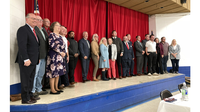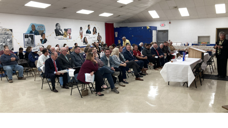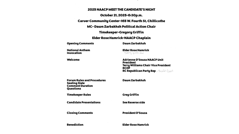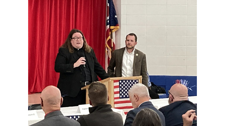2 of 8 In the welcome, the Reverend Terry Williams speaks as vice president of the Ross County Democratic Party, with David Glass, past chair of the Ross County Republican Party.
