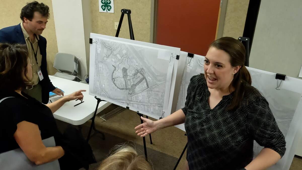 City employees Tricia Hall and Clint Boggs explain one of five station in the roundtable-style open house.