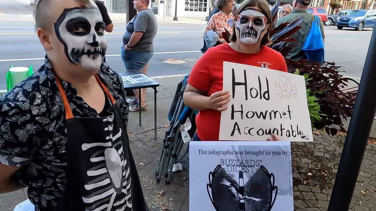 Activists gathered in front of old City Hall, and two members spoke to Chillicothe Council, on concerns about the Wear-Ever pollution, at the August 25th, 2025 council session. Painted with skull faces, they handed out brochures on “Poisoned Water?” by the new “Buzzards’ Digest,” labeled as “Chillicothe’s Working Class Press.”
