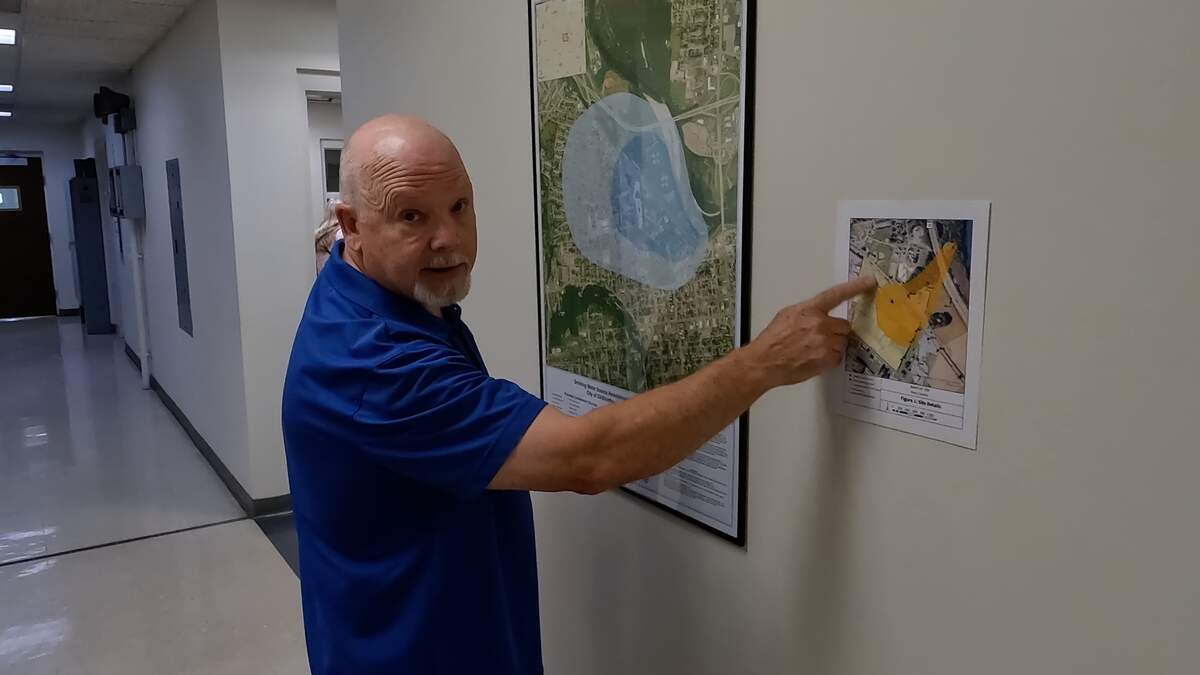 Tom Jenkins, Water Treatment Plant Manager, explains maps posted in the hallway
